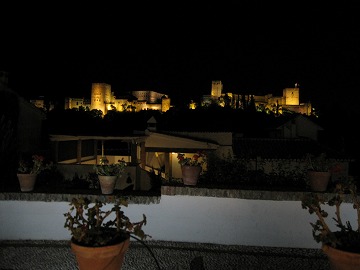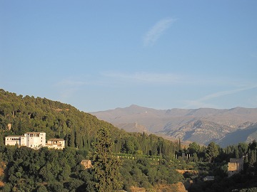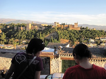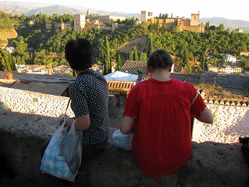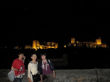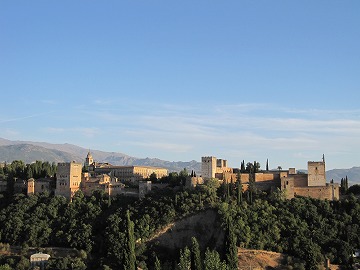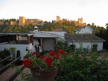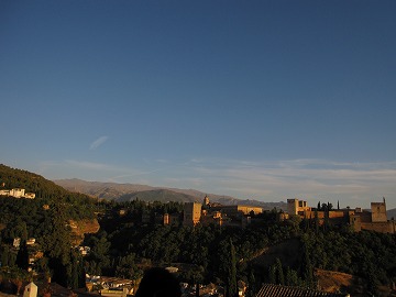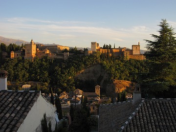 夕日を浴びた、アルハンブラ宮殿の全景を観ましょう。