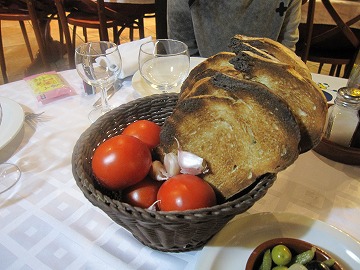 「パン コン トマテ」にんにくをパンにすりつけます。